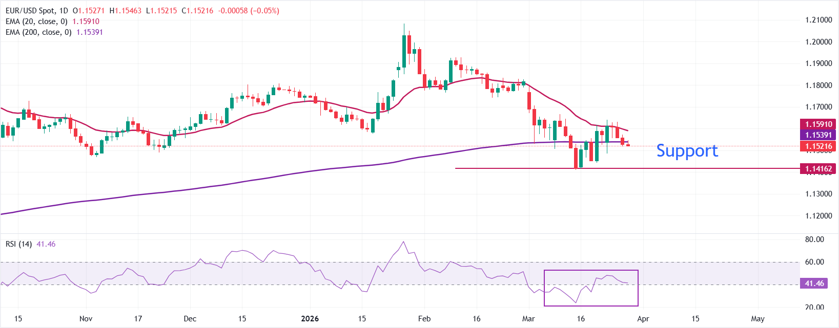 截至發稿,歐元/美元在1.1520附近下跌。該貨幣對略高於200日指數移動平均線(EMA)附近的1.1540,同時在20日EMA約1.1590下方延續一系列較低高點,維持在更廣泛橫盤格局中的短期適度看跌偏向。