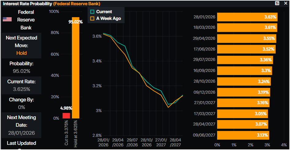 市場仍在定價今年大約兩次降息。然而,交易員們現在幾乎完全相信美聯儲將在1月27-28日的會議上維持利率不變,而對3月降息的預期有所減弱。根據CME FedWatch工具,3月降息的概率已降至29.6%,低於前一天的38.6%。