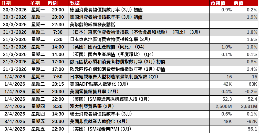 本周美國將公布非農就業數據。屆時投資者宜留意各國經濟狀況,從而適度調整投資策略。
