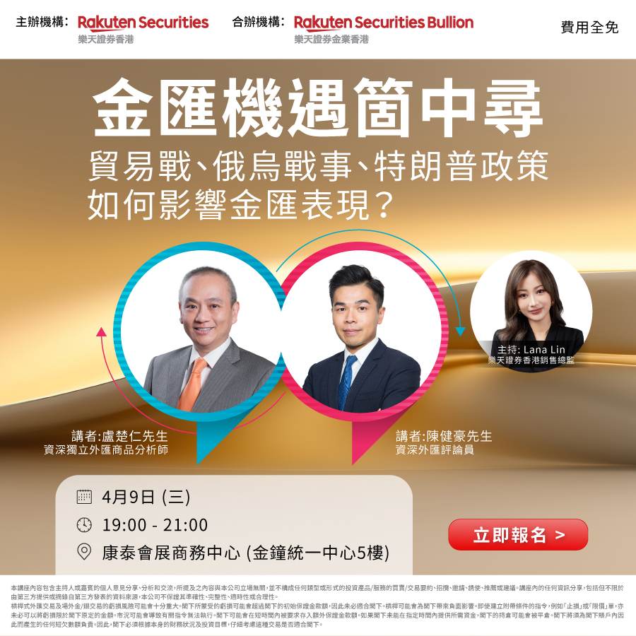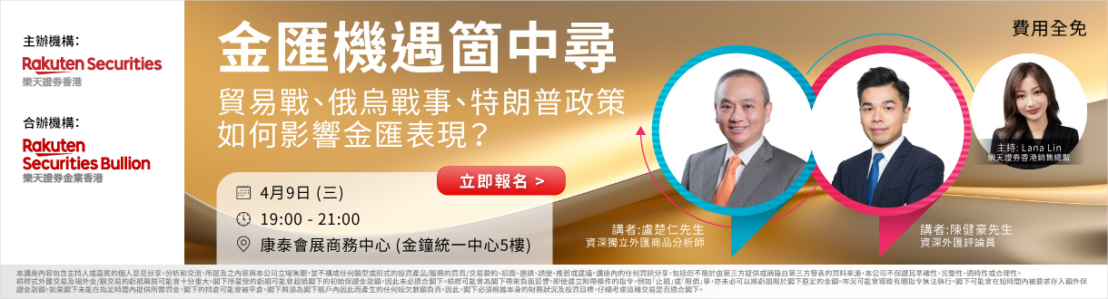 免責聲明: 此活動由樂天證券香港舉辦,樂天證券金業合辦。本活動並非及不應被視為邀約、招攬、邀請、建議買賣任何投資產品或投資決策之依據,亦不應被詮釋為專業意見。 投資涉及風險。 參與本活動的人士或在作出任何投資決策前,應完全了解其特點及風險,仔細考慮有關產品或服務是否適合本身的情況包括財務狀況及需要、投資目標及經驗。 必要時應尋求適當的專業意見。