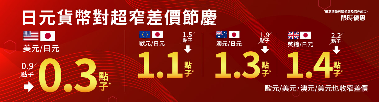 - 持有合資格賬戶的客戶可於推廣期内的正常市場情況下以超窄買賣差價交易美元/日元、澳元/美元、歐元/美元、歐元/日元、澳元/日元、英鎊/日元貨幣對。