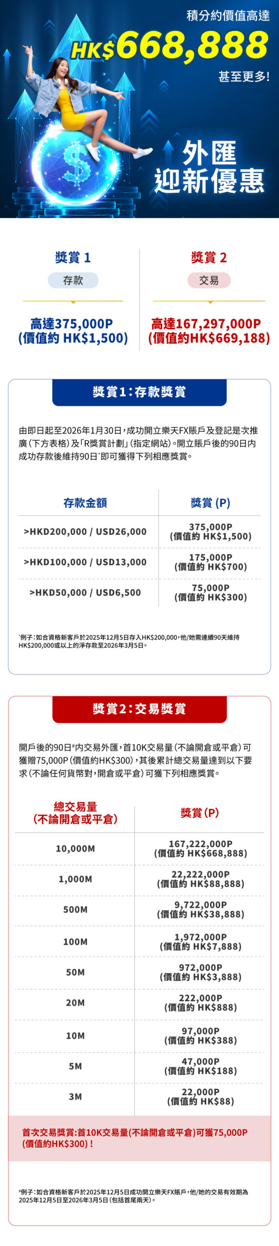 7. 新客戶於交易有效期内達10K交易量(任何貨幣對,不論開倉或平倉)可獲75,000P(價值約HK$300)(「首次交易獎賞」)。
