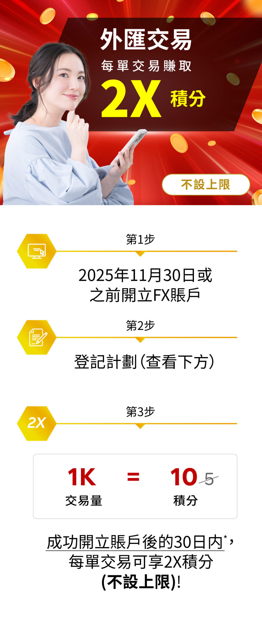 6. 合資格客戶於交易有效期内以合資格賬戶交易(不論開倉或平倉)任何貨幣對,除可享原有的一般交易積分外,更可獲得額外一倍的積分(「迎新積分」)。迎新積分及一般交易積分不設上限。