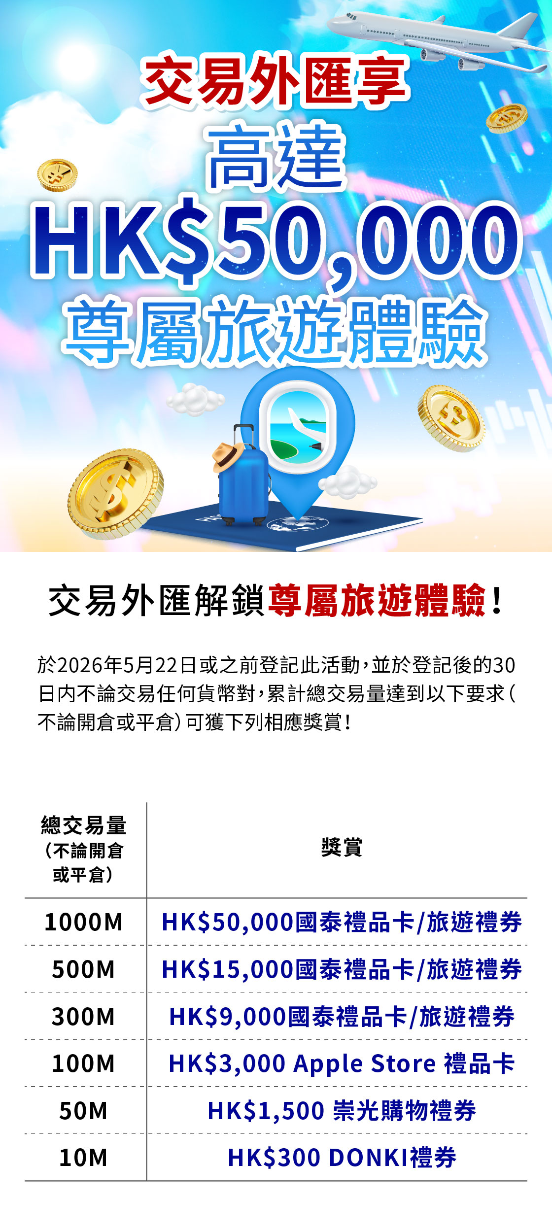 - 合資格客戶於交易有效期内交易任何貨幣對,並達到以下總累積指定交易量(不論開倉或平倉)可獲得以下獎賞(「交易獎賞」)。