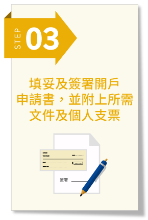 – 申請人須提供一張金額為10,000港元或以上的個人支票,賬戶在支票兌現後啟動。