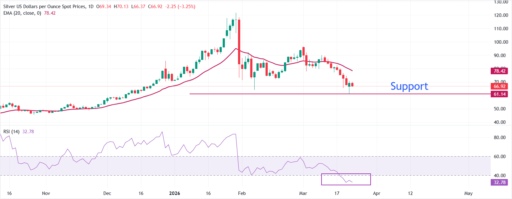 白银(XAG/USD)在周一强劲反弹后,于周二恢复更广泛的下跌趋势,因伊朗否认与美国就解决中东战争进行谈判。发稿时,XAG/USD下跌3.2%,至约66.90美元附近。