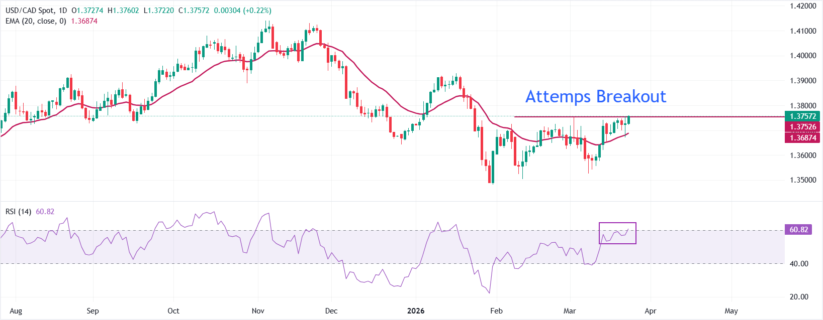 美元/加元在周二欧洲早盘交易中上涨0.25%,接近1.3760,为近两个月来的最高水平。由于伊朗驳斥了美国总统唐纳德·特朗普关于中东战争降级谈判的声明,美元(USD)反弹,推动该货币对上涨。