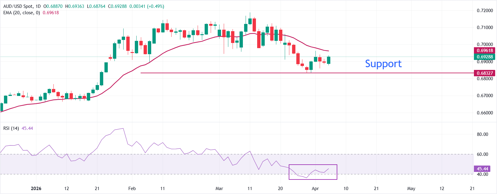 截至发稿时,澳元/美元显著走高,报约 0.6930。该货币对保持一系列较低的高点,价格维持在 20 日指数移动平均线(EMA)约 0.6960 以下,维持温和的短期看跌偏向。