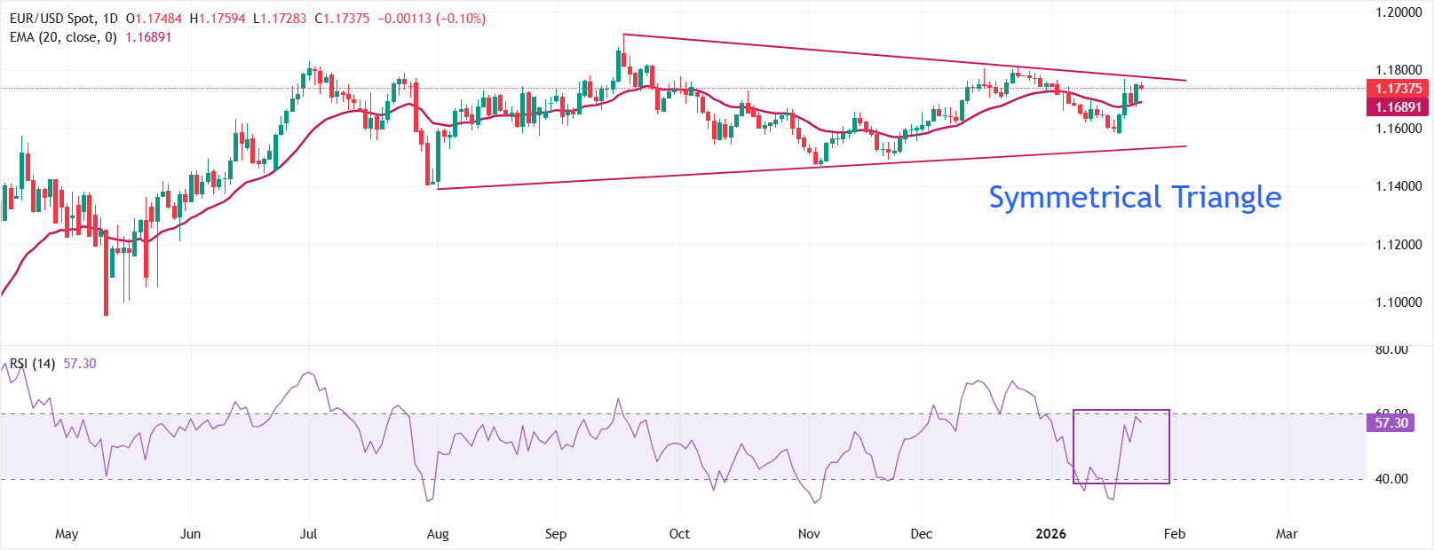 技术图形显示,英镑/日元保持上行偏向,尽管在1月13日达到214.29的年度高点后回落至211.00附近。从那时起,该货币对在211.00至213.00区间内整合,随后买方突破了区间顶部,试图挑战当前的年度高点。