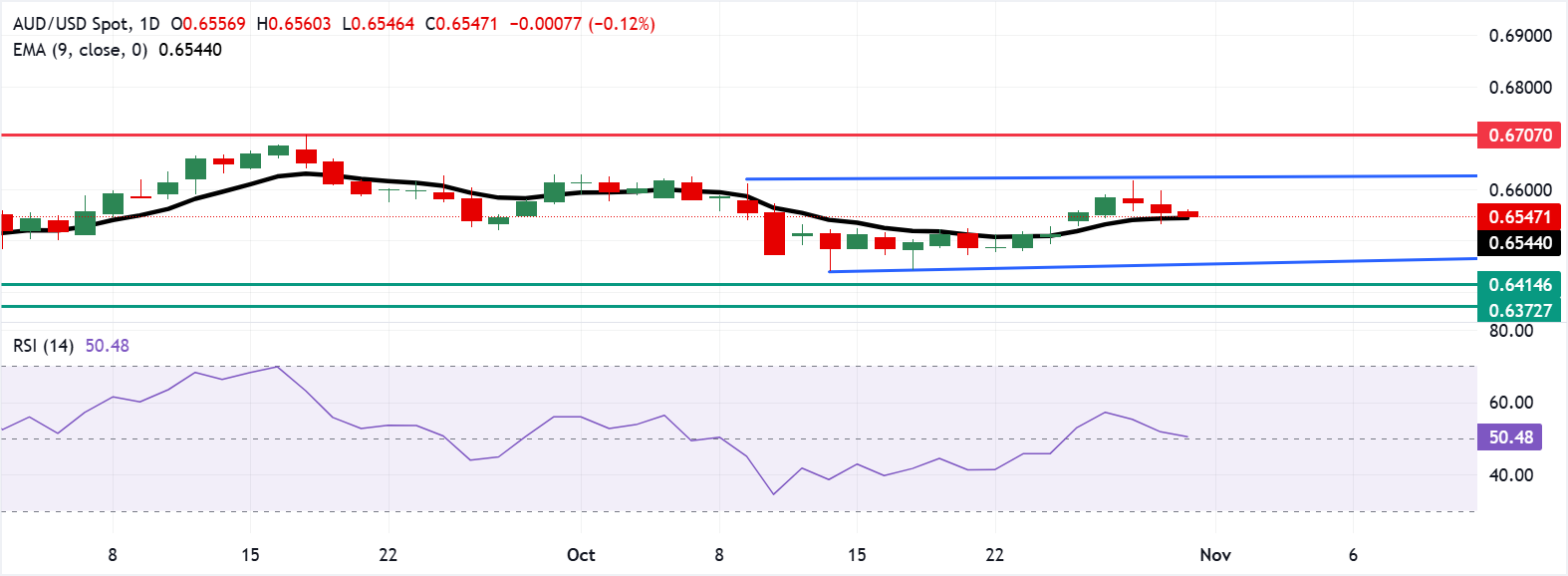 澳元在0.6550附近徘徊,接近九日EMA支撑位