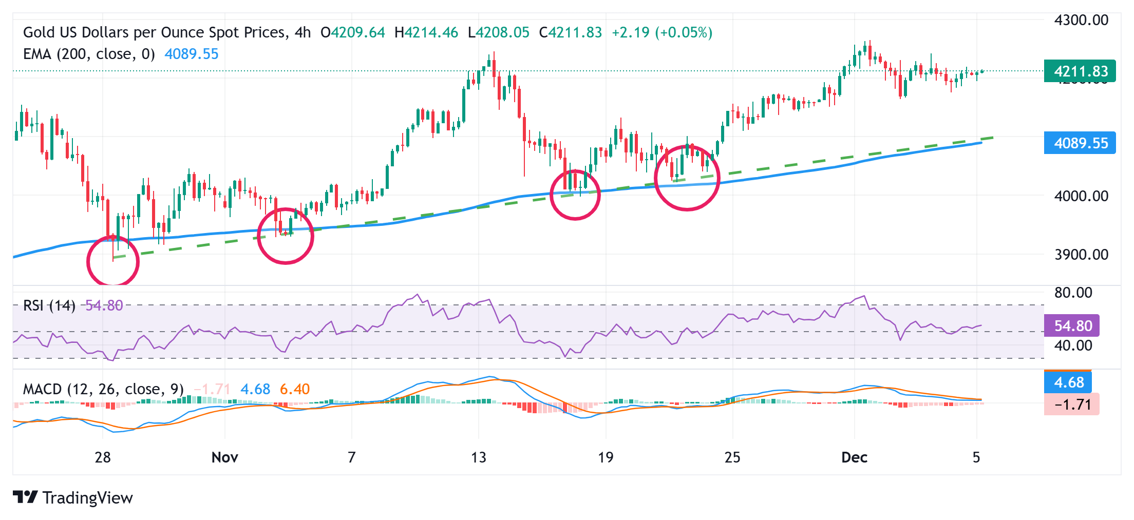 在撰写本文时,黄金/美元交易接近4215美元,鸽派的美联储(Fed)预期继续提供支持,尽管日内回调,但仍帮助限制下行。