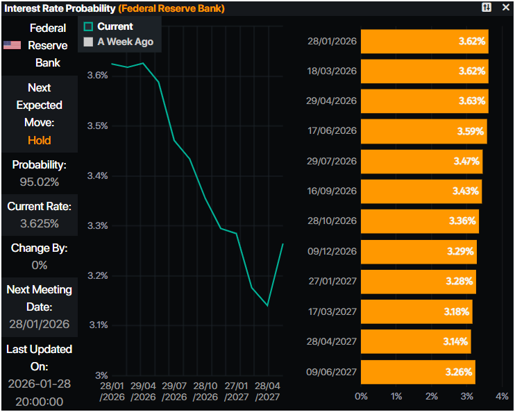 - 由Prime Market Terminal披露的货币市场数据显示,美联储维持利率不变的概率为95%。全年交易者关注46个基点的降息。