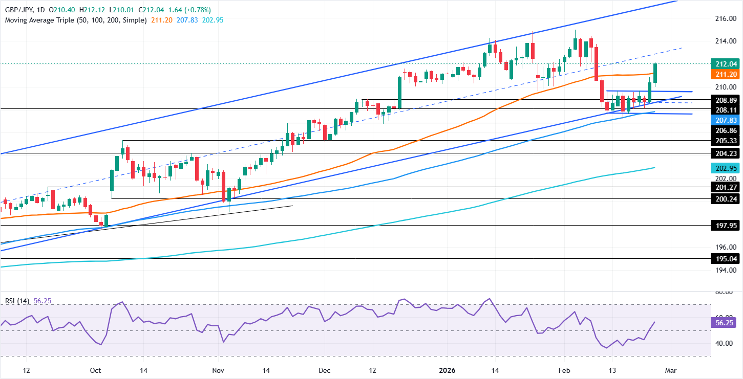 技术图形显示,上升趋势已恢复,在100日均线与支撑趋势线交汇附近约207.62触底后,英镑/日元的看涨动能上升,因相对强弱指数(RSI)强劲突破50中性水平,表明买方力量。