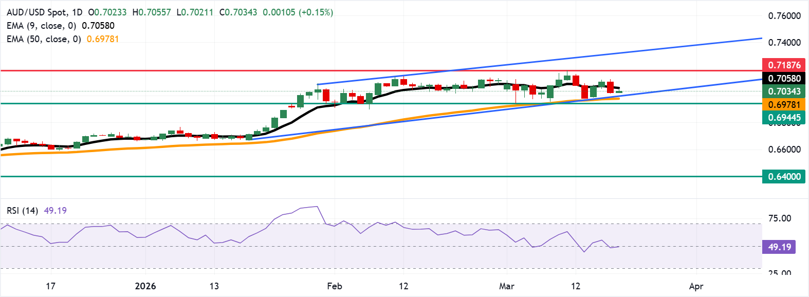 澳元/美元持稳于上升的50日指数移动平均线(EMA)之上且九日均线之下,显示短期内在整体上升趋势中盘整,中期均线提供支撑,九日均线限制近期上涨空间。