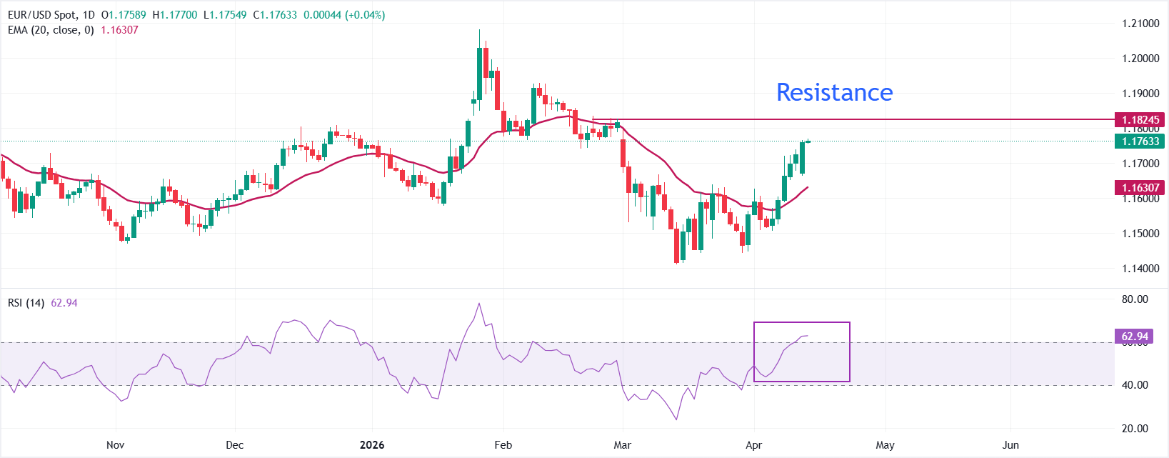 截至发稿时,欧元/美元在1.1760附近表现强势。该货币对保持短期看涨偏向,现货价格维持在20日指数移动均线(EMA)1.1631之上,支撑近期涨势。