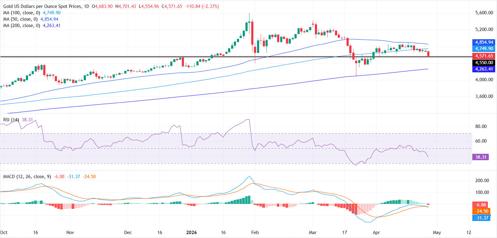 日线图显示,黄金/美元维持受限走势,现货价格保持在200日简单移动均线(SMA)4257美元上方,但仍低于100日和50日SMA。