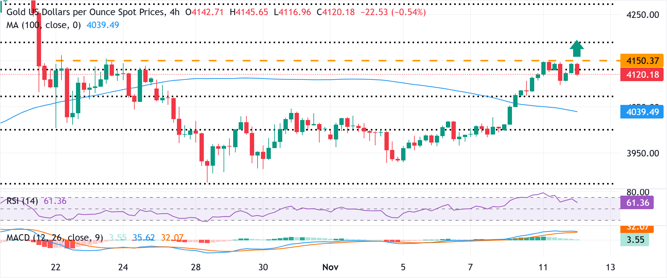 黄金(黄金/美元)在周三亚洲时段徘徊在三周高点附近,多头等待突破$4,150-4,155的水平障碍,然后再进行进一步的上涨布局。投资者似乎相信,由于美国政府的长期停摆,延迟的美国宏观数据将显示经济的某些疲软,并促使美联储(Fed)在12月进一步降低借贷成本。鸽派前景使美元(USD)接近周二触及的近两周低点,并成为对无收益的黄金形成支撑的关键因素。