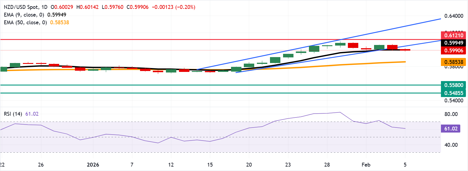 即时阻力位在9日EMA的0.5994。若反弹突破短期均线,将支持该货币对回归上升通道,并目标看向16个月高点0.6121,该高点于2025年7月创下。进一步上涨将引导纽元/美元货币对探索上升通道上边界附近的区域0.6270。