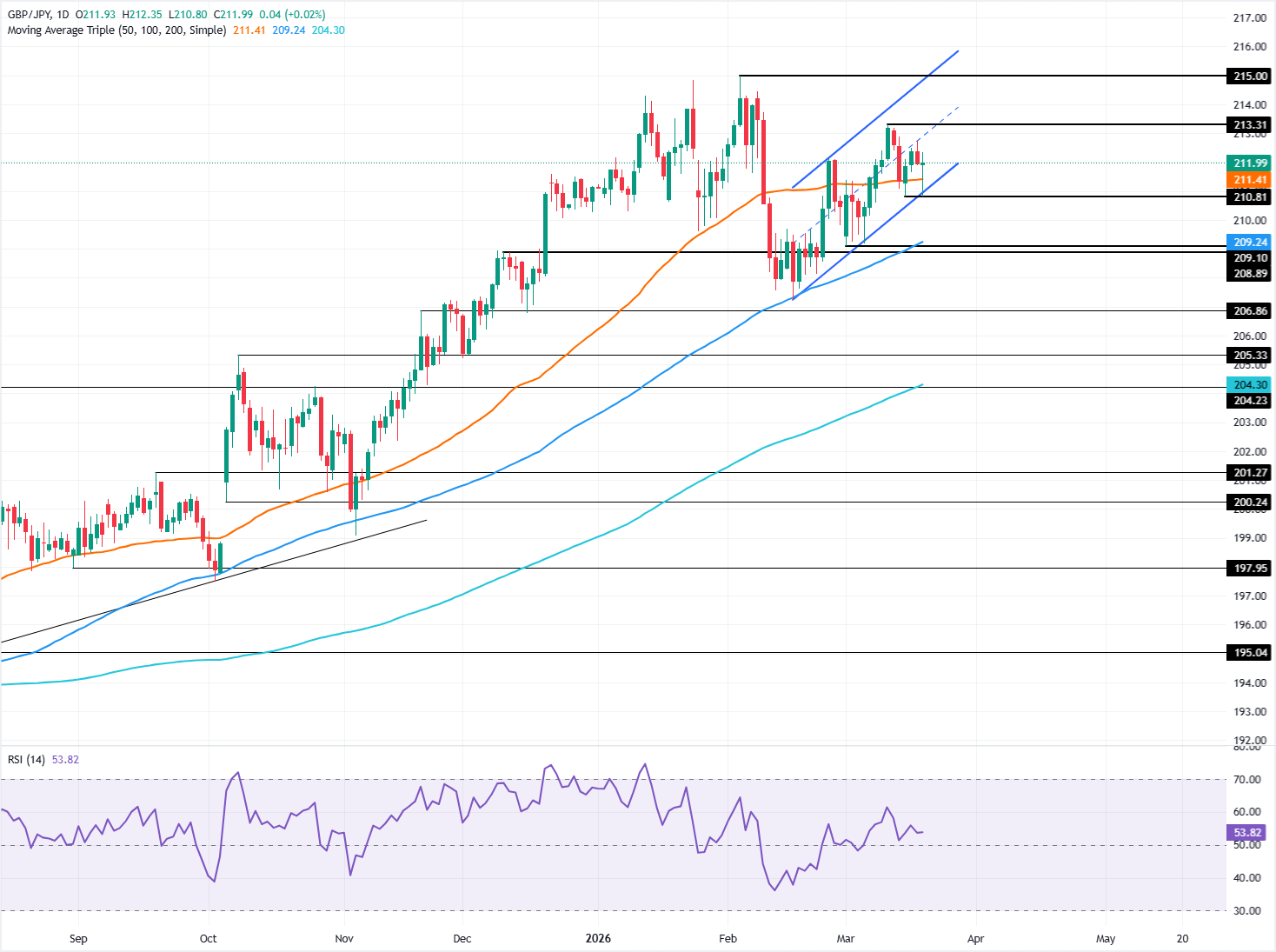英镑/日元技术面偏向看涨,价格走势在上升通道内运行,20日、50日、100日和200日简单移动平均线(SMA)提供支撑。