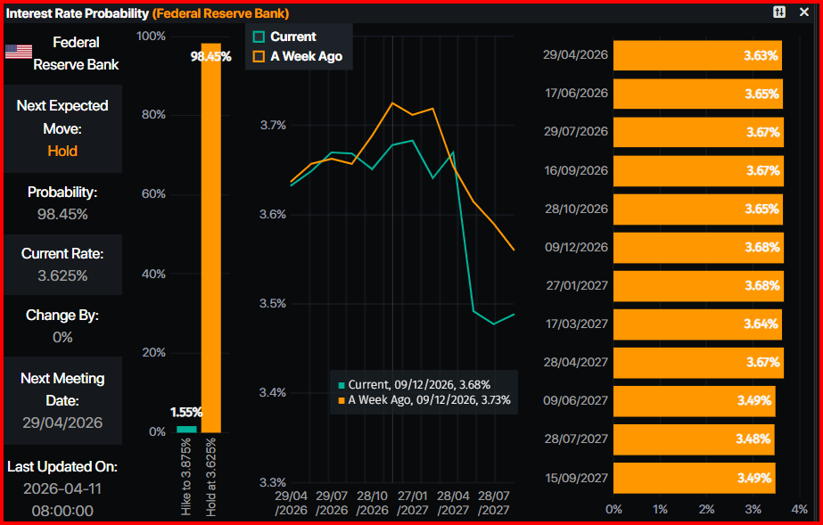 与此同时,中东地区冲突升级引发的能源冲击加剧了对通胀压力可能飙升的担忧。此外,周五公布的数据显示,由于战争驱动的能源价格飙升,美国3月消费者通胀录得近四年来最大涨幅,市场关注今年潜在的加息动作。然而,芝商所集团的FedWatch工具显示12月有30%的概率降息25个基点(bps),这进一步削弱美元,有利于无收益资产黄金。
