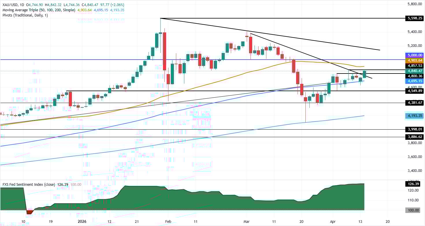 在前一日良好反弹的背景下,若能突破3月下跌的50%回撤位,将被视为黄金多头的关键触发点。然而,贵金属仍受制于200周期简单移动平均线(SMA)4,854.58美元下方,整体基调保持轻微看跌。