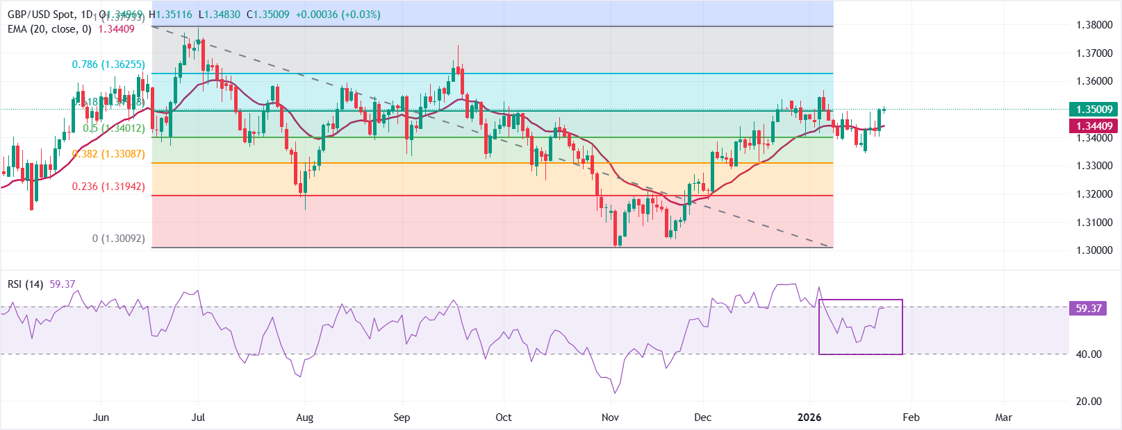 截至发稿时,GBP/USD在1.3500附近保持涨势。价格保持在1.3441的20日指数移动平均线(EMA)之上,保持短期偏向上行。