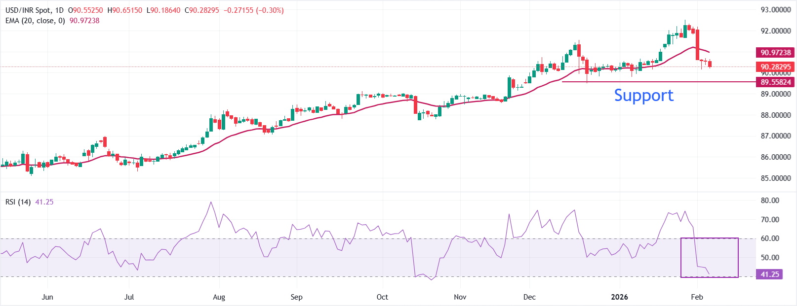 美元/印度卢比(USD/INR)在撰写时跌至接近90.30。该货币对保持在20日指数移动平均线(EMA)下方,该均线已开始下滑,保持了短期看跌偏向。均线的下行斜率突显出上行压力的减弱。