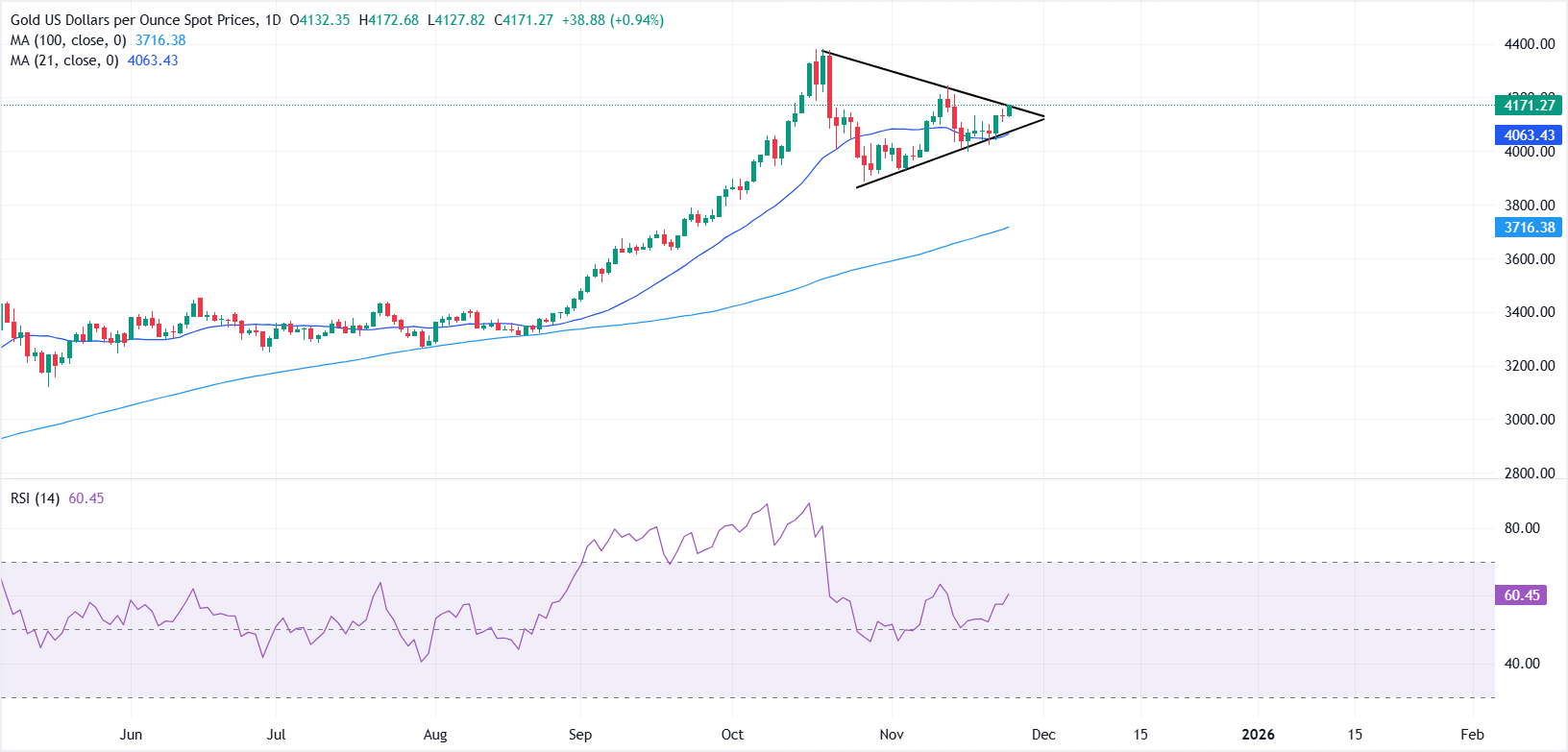 从技术角度看,黄金正在尝试突破日线图上的对称三角形模式。成功突破模式阻力将加强看涨趋势,为4200美元和4250美元附近的上行目标打开大门。