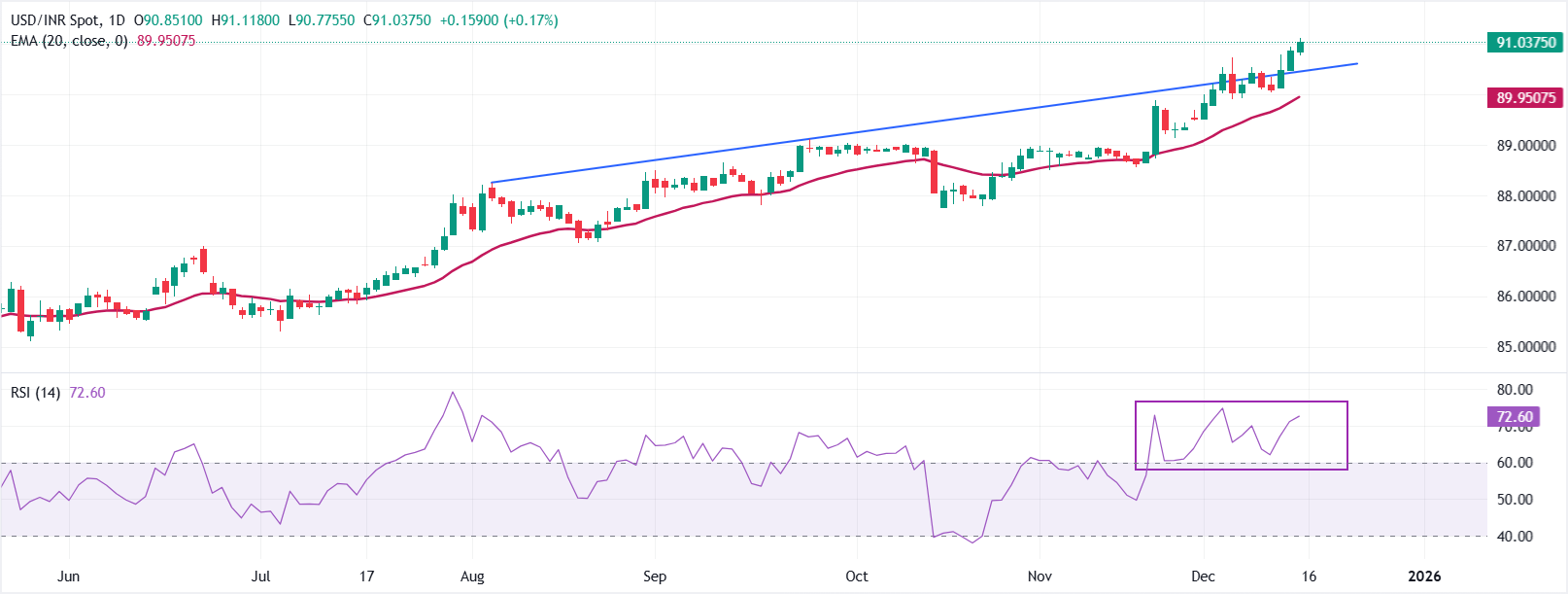 美元/印度卢比(USD/INR)周一交易价格在90.94附近。20日指数移动平均线(EMA)在89.9414上升,价格保持在其上方,短期趋势向上。自88.64以来的上升趋势线支撑了看涨偏向。