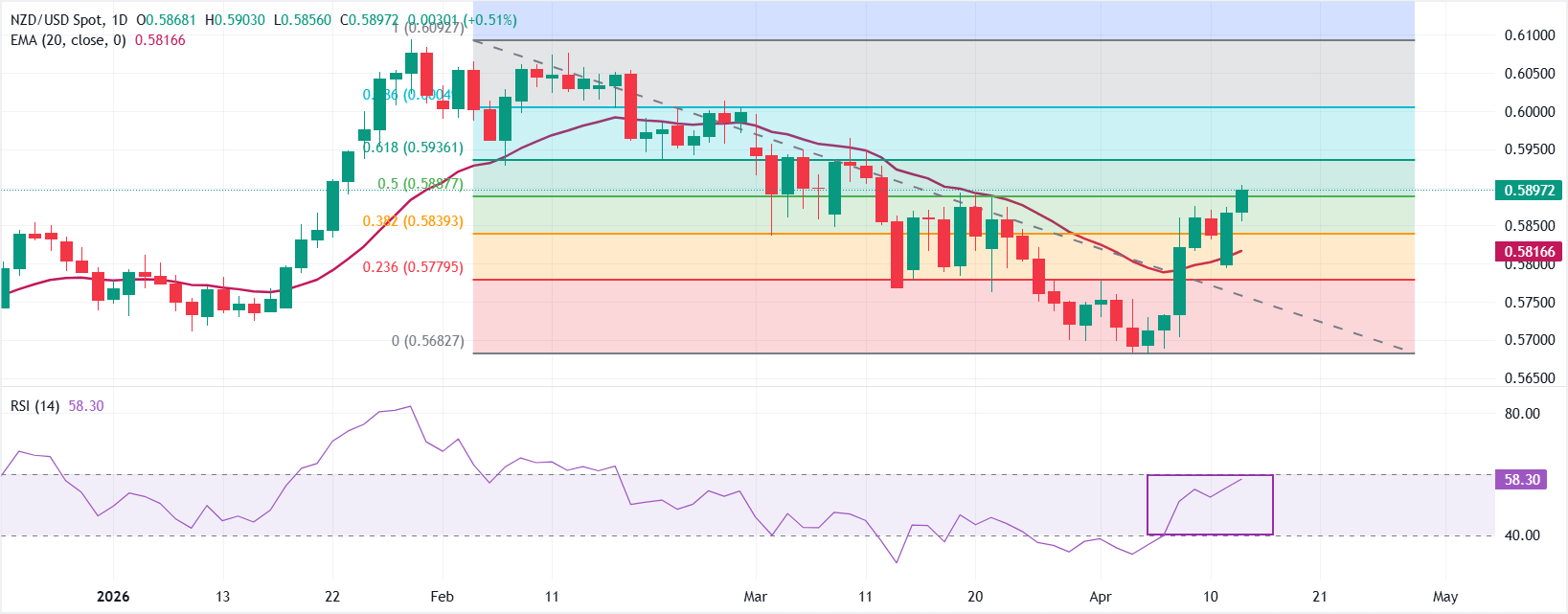 纽元/美元当前交易于约0.5900,反映出短期看涨态势,现货价格保持在20周期指数移动平均线(EMA)0.5817之上。同时,价格延续了对50%斐波那契回撤位0.5888的突破反弹。