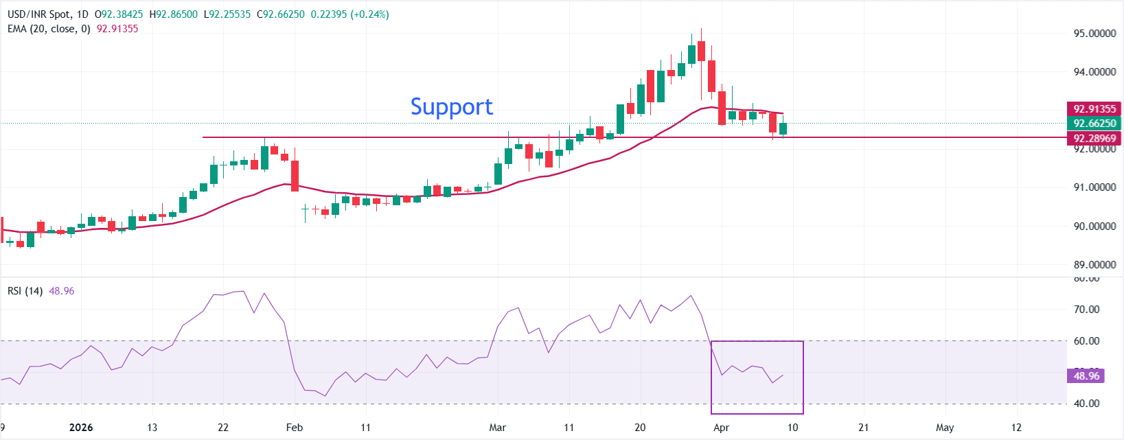 早盘交易中,美元/印度卢比在92.60附近走高。然而,短期走势似乎偏空,因现货价格位于92.90的20日指数移动均线(EMA)下方。该货币对在近期回调后未能重新站上该动态阻力位,表明上涨尝试暂时受限,而相对强弱指数(RSI)在40中位附近,暗示看涨动能减弱,而非明显超卖状态。