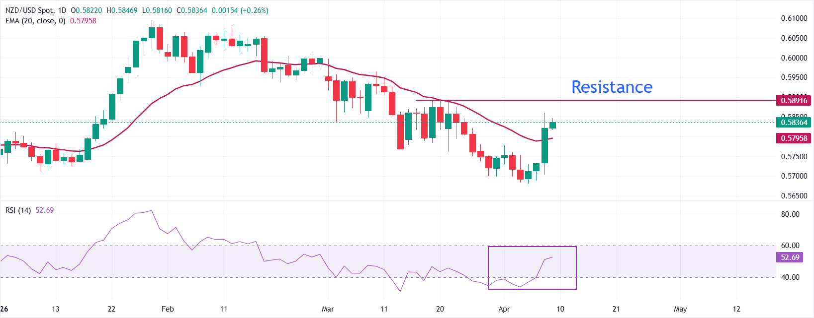 - 纽元/美元从约0.5680的四个月低点强劲反弹,突破20日指数移动均线(EMA)。