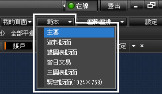 设有6个范本可供选择 - 「主要」丶「资料版面」丶「双图表版面」丶「当日交易」,「三图表版面」,和「紧密版面」。 所有范本均可修改并储存为新的「我的页面」。