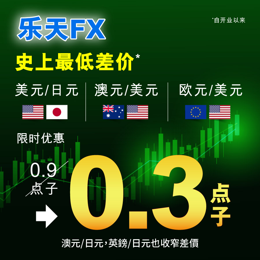 由2025年10月6日(开市)至2025年10月31日(收市)期间,乐天FX的5组特选货币对买卖差价将会收窄。不限交易量或交易次数,您都可于推广期间以超窄差价进行外汇交易。