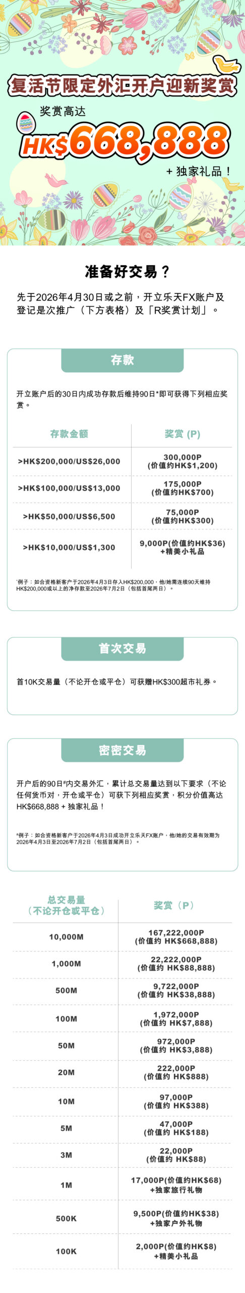 - 本推广适用于由20 26年4月1日至202 6年4月30日(包括首尾两天)期间(「开户推广期」)成功开立乐天FX账户,及现未持有并于本推广的开始日期前十二(12)个月内未曾取消任何乐天证券香港交易账户之新客户(「新客户」)。