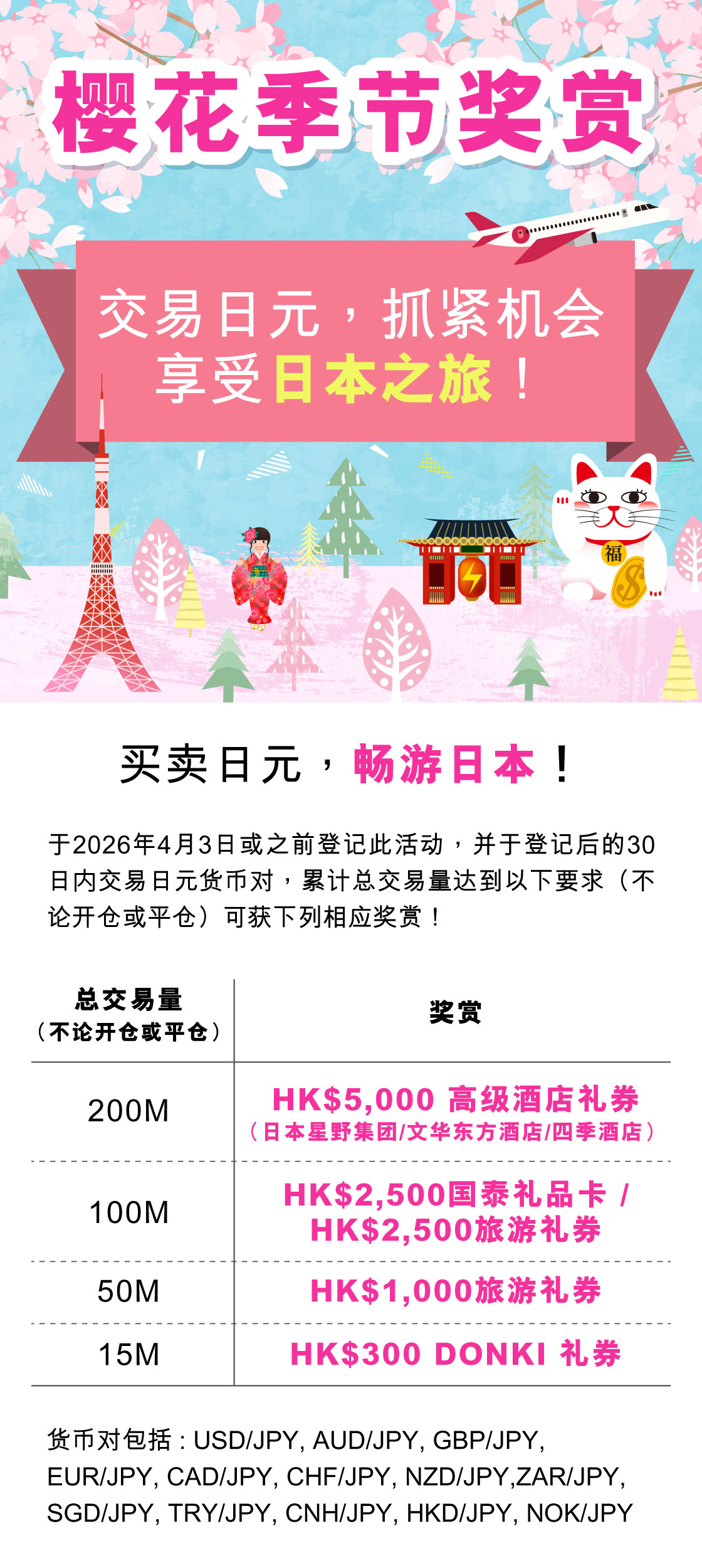- 合资格客户于交易有效期内交易指定货币对(包括:USD/JPY, AUD/JPY, GBP/JPY, EUR/JPY, CAD/JPY, CHF/JPY, NZD/JPY,ZAR/JPY, SGD/JPY, TRY/JPY, CNH/JPY, HKD/JPY, NOK/JPY ) ,並达到以下总累积指定交易量(不论开仓或平仓)可获得以下奖赏( 「交易奖赏」 )。